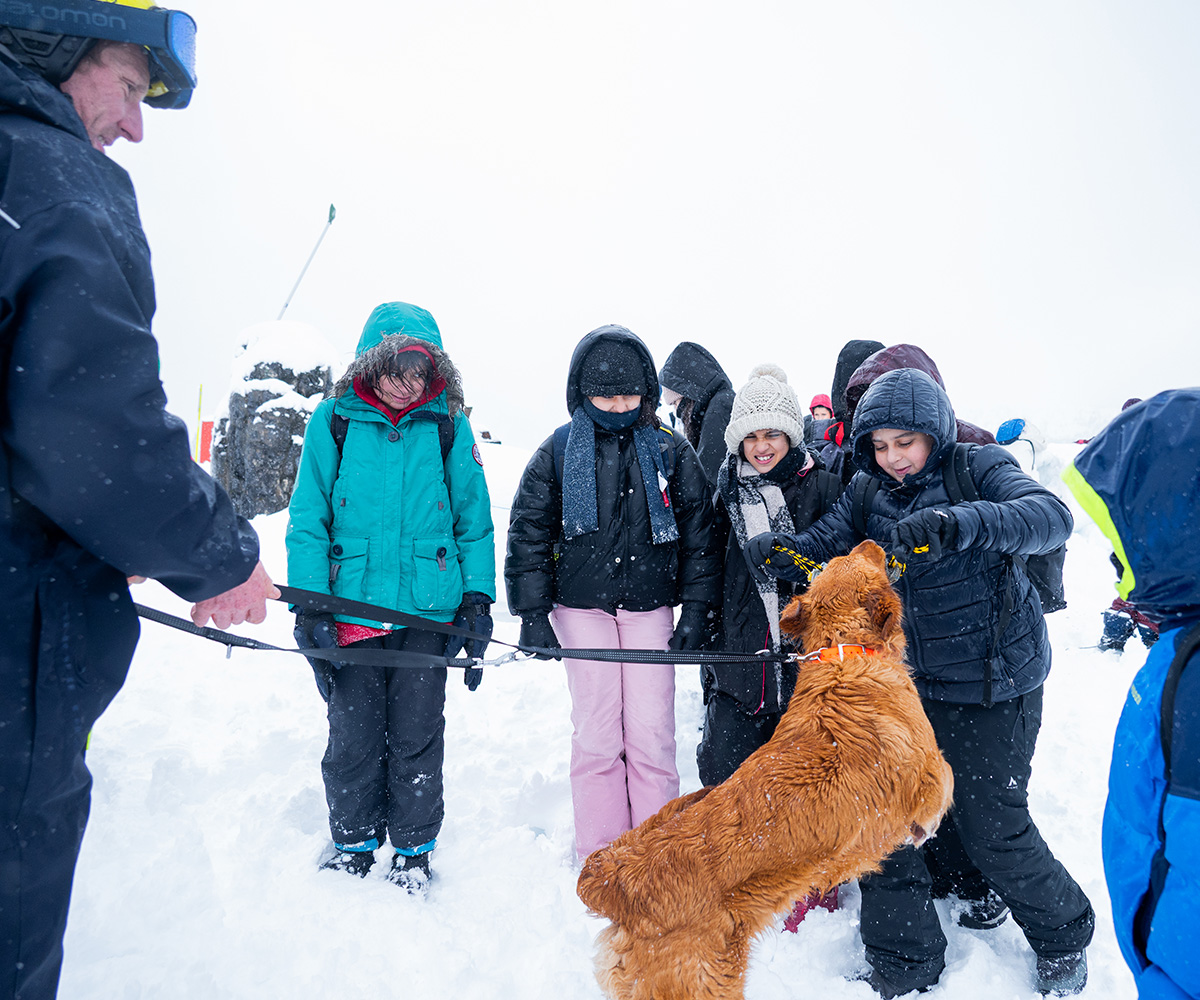 Cette matinée a également été marquée par une rencontre pas comme les autres : celle d’Aspen, chien d’avalanche. Curieux et impressionnés, les enfants ont pu découvrir le rôle essentiel de ces chiens spécialement formés pour participer aux opérations de secours en montagne.
