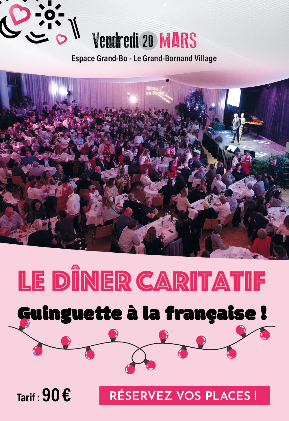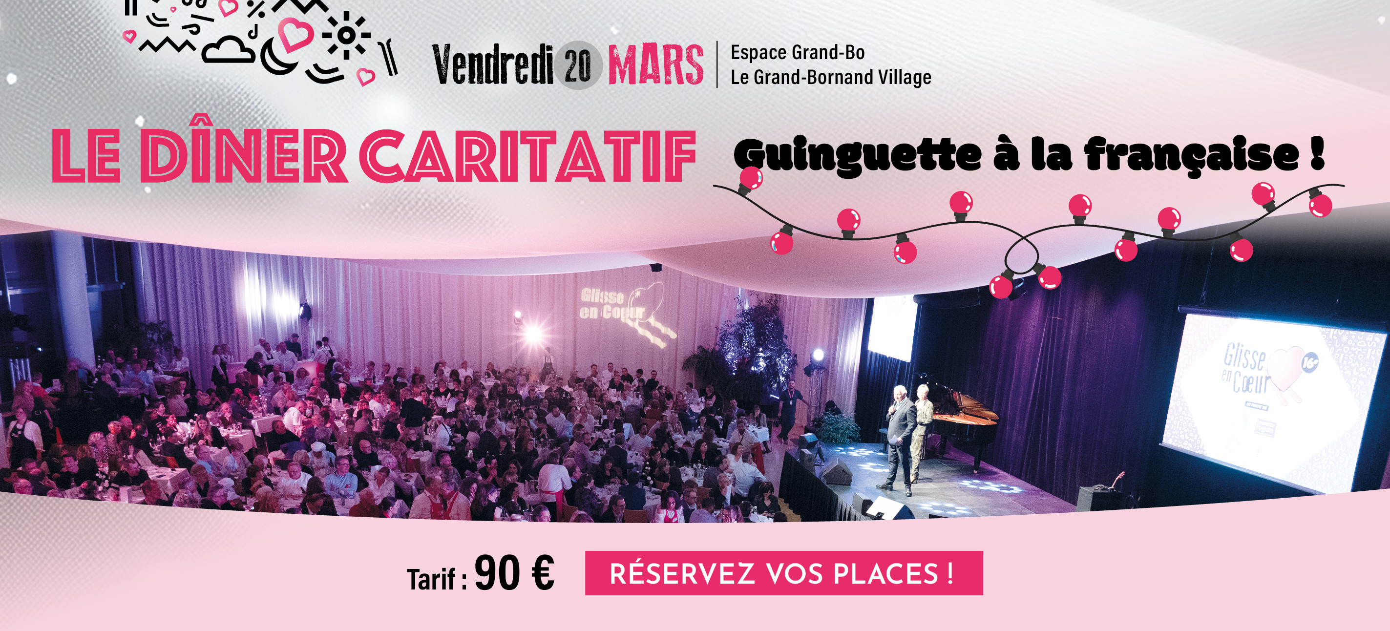 Espace Grand-Bo - Le Grand-Bornand Village Ouverture des portes à 19h Tarif : 90€/pers. (1 coupe de champagne offerte) Placement à table numéroté Étant donné la configuration de la salle, afin d'optimiser son remplissage et éviter au maximum les places seules isolées, il est obligatoire de réserver des lots de 2 places ou multiples de 2.